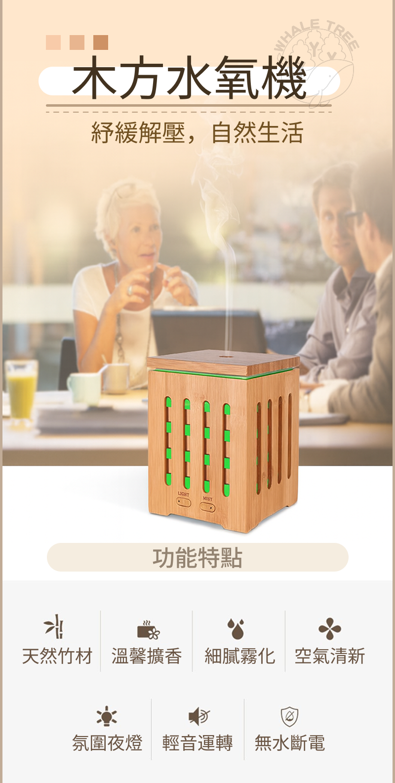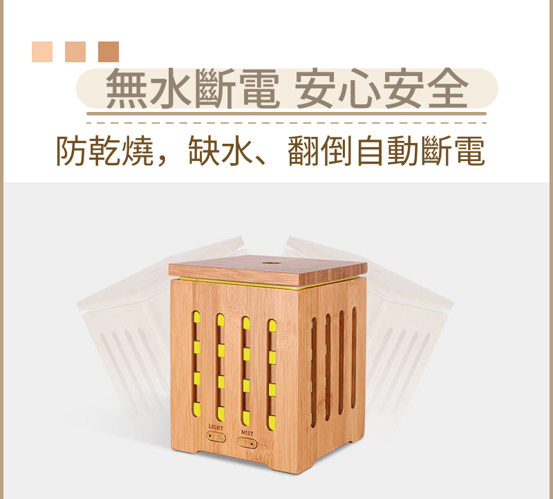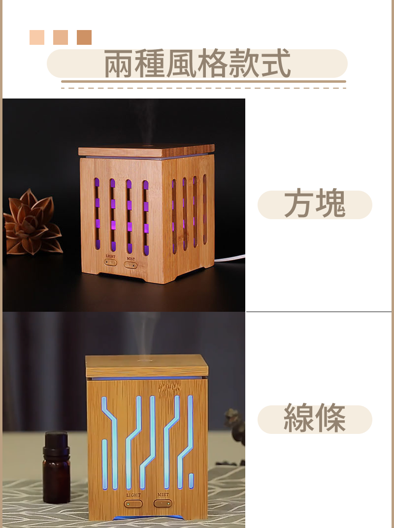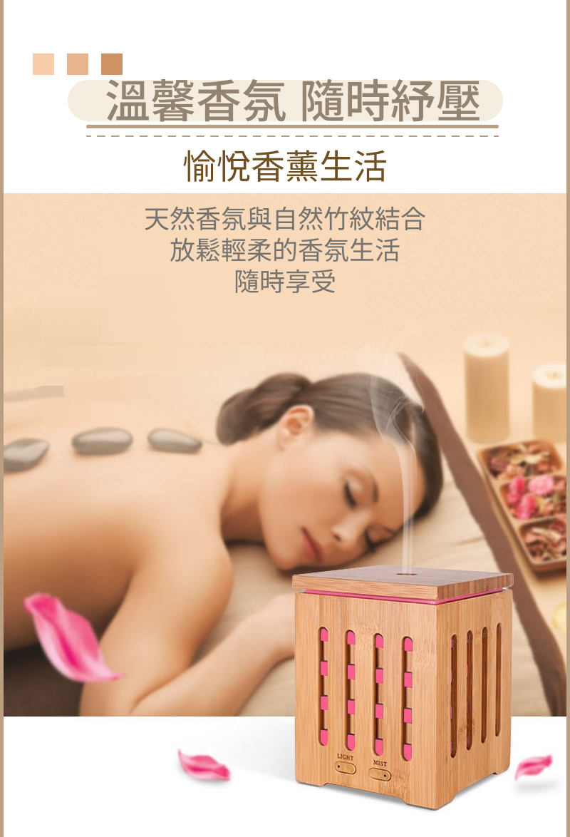 本產品採用超音波震盪技術,透過高頻震動將水與精油分解為極細微水霧粒子,經由氣流擴散至空氣中。