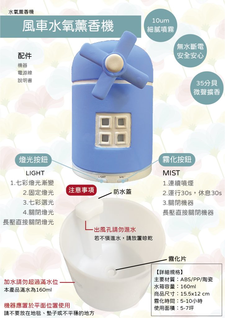 本產品採用超音波震盪技術,透過高頻震動將水與精油分解為極細微水霧粒子,經由氣流擴散至空氣中。