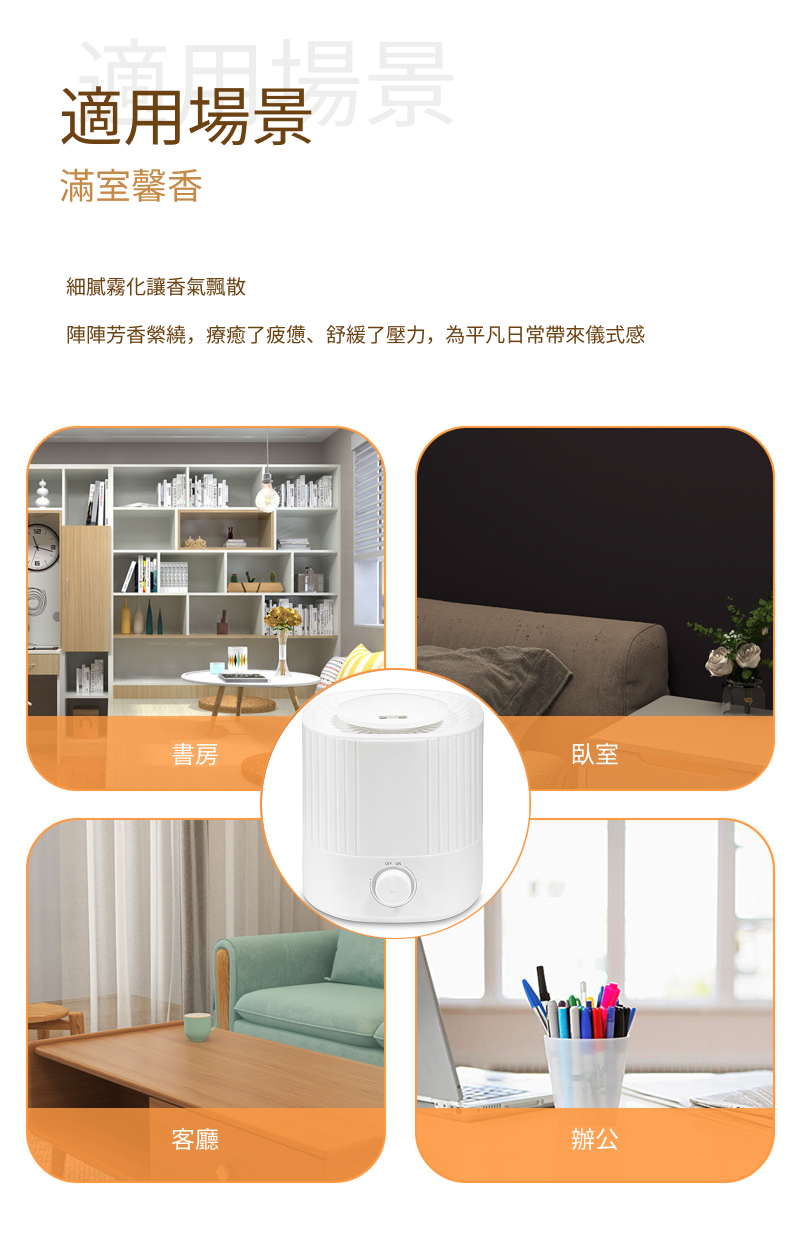 本產品採用超音波震盪技術,透過高頻震動將水與精油分解為極細微水霧粒子,經由氣流擴散至空氣中。